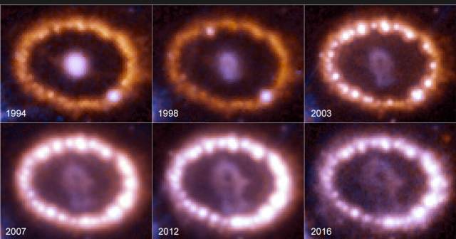 SN 1987 A की 30 वीं वर्षगांठ के मौके पर आई एन एएफ- ओस्वर्टोरियो स्ट्रोनॉमिक डी पलेर्मोर, इटली में सल्वाटोर आयरलैंडो के नेतृत्व में नई तस्वीरे, टाइम लूप्स फिल्मे जारी किये जा रहे हैं। 1990 से हबल ने बार नर SN 1987 या को देखा है तब से इसकी तस्वीरो को जमा करते आ रहा है। हबल के अध्ययनों से आयात चलता है कि सुपरनोवा के आसपास घने गैस के बादलों का एक गोल छल्ला है जो ऑप्टिकल प्रकाश में चमक रहा है। इस तारे का विस्फोट आज से 20000 साल पहले हुआ था। विस्फोट में पैरावैगानी किरण की एक फ़्लैश ने इसके छल्ले के सक्रिय गैस में चमक पैदा कर दी तब से यह आज तक चमक रहा है। हबल तस्वीर में दिखाई देने वाली केंद्रीय संरचना लगभग पूरे आधे प्रकाश वर्ष में फैली है। इसके केंद्र में मलबे लगभग 20 मिलियन प्रति घंटे की रफ़्तार से फैल रही है। 1999 से 2013 तक के चंद्र आकड़ो में एक्सरे उत्सर्जन के छल्ले दिखाई गई है जो लगातार फ़ैल रही है।