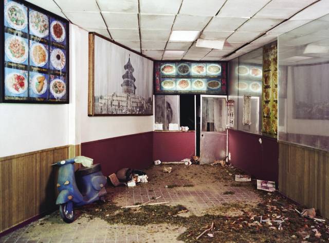 बिना इंसानों के चीनी ले आउट रेस्तरां, गंदे और सुनसान।